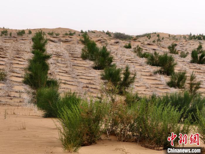 夏日驕陽炙烤著九棵樹治沙項目區,廣袤的沙地上,一排排整齊的草方格如同給沙丘上了“鎖鏈”,而這些被固定住的流沙,為植被生長創造了重要條件。