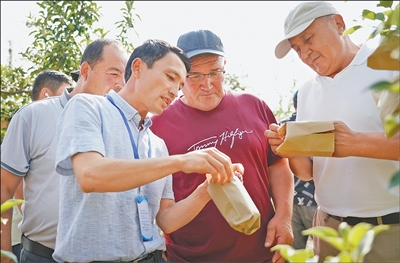 近日,2025年首期中國(guó)—中亞五國(guó)職業(yè)農(nóng)民培訓(xùn)班在陜西渭南開(kāi)班。圖為學(xué)員們?cè)谖鞅鞭r(nóng)林科技大學(xué)蘋(píng)果試驗(yàn)站了解蘋(píng)果套袋知識(shí)。