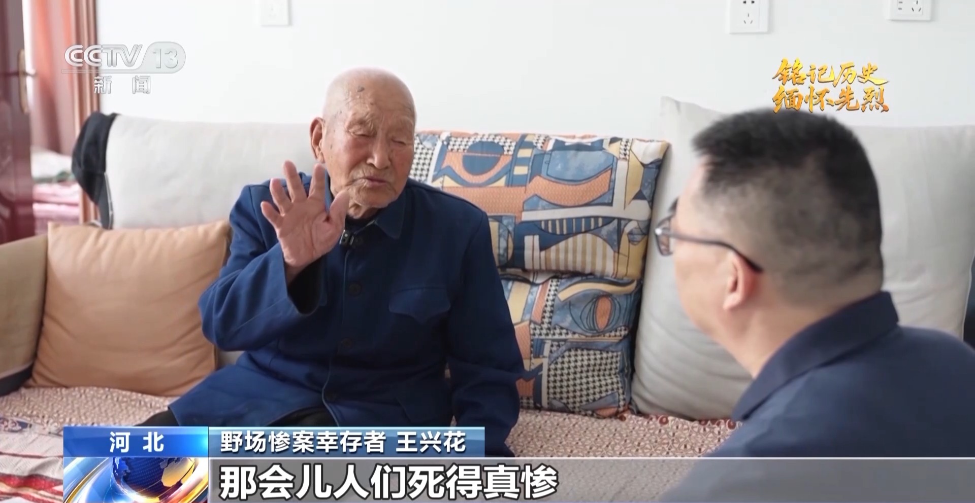 野場慘案幸存者 王興花:那會兒人們死得真慘。日軍頭一次問,八路軍東西在哪兒,都說不知道,第二次還問還是這一套,第三次日軍說,說了你們就能活,要不說統統開槍滅掉你們,王璞站起來說不知道,大家伙一致說不知道。