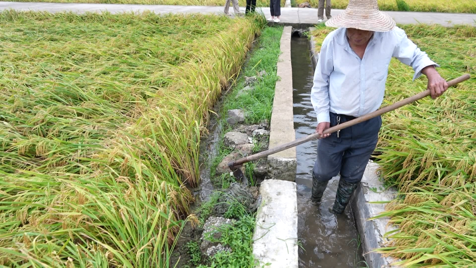 農技專家楊煥清來到現場指導農戶搶收,“它倒平后很容易會發芽,稻谷發芽以后就沒有價值了。現在主要就是開溝排水,一有晴天馬上搶收。”