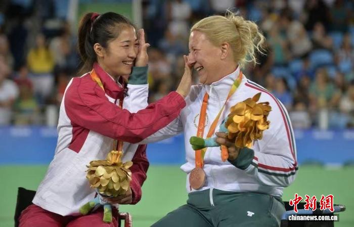 2016年9月14日,里約殘奧會,輪椅擊劍女子個人花劍A級比賽冠軍獲得者中國選手榮靜正與獲得銅牌的匈牙利選手克拉伊尼亞克相互擦拭喜悅的淚水?!∷_樂馬什 攝