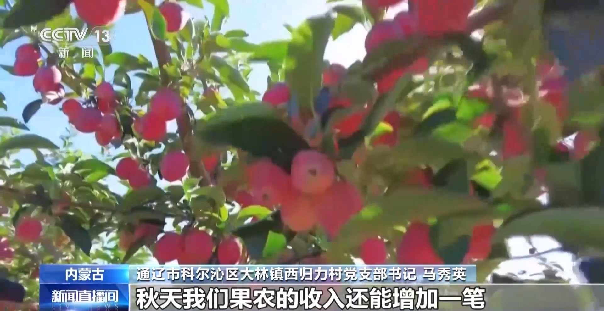 通遼市科爾沁區大林鎮西歸力村黨支部書記 馬秀英:今年的果長得特別好,我們引進了深加工,秋天我們果農的收入還能增加一筆。