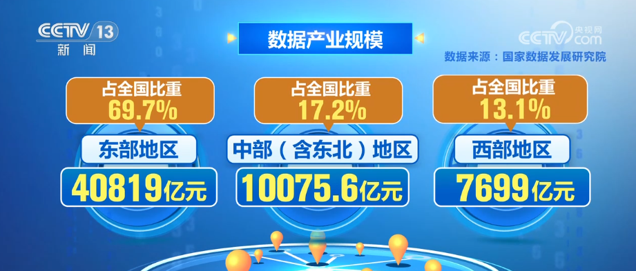 我國數據產業呈現梯次分布格局,東部、中部(含東北)和西部地區的數據產業規模分別為40819億元、10075.6億元和7699億元,占全國比重分別為69.7%、17.2%和13.1%。