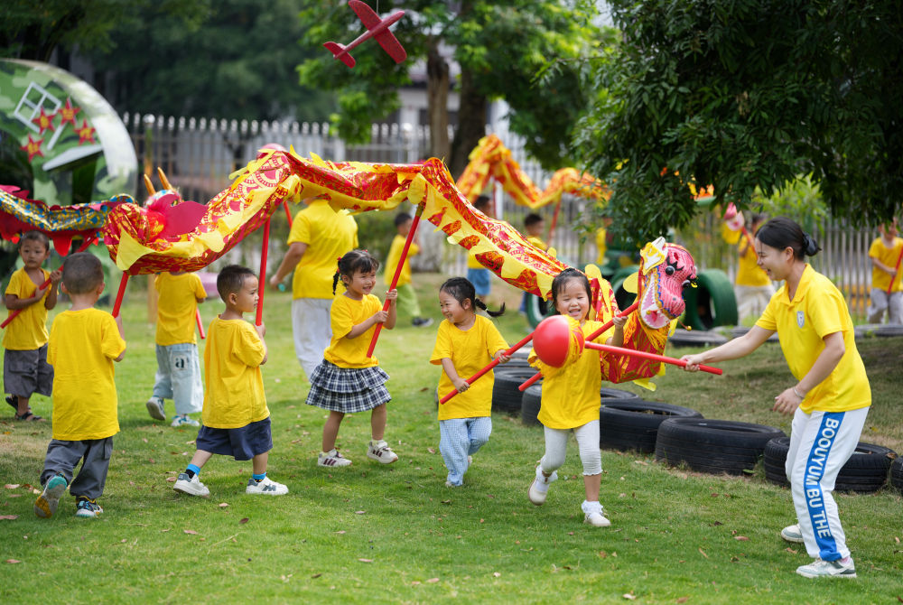 9月5日,四川瀘州白酒產業園區天驕托育園的老師帶領孩子們舞龍。新華社記者 江宏景 攝