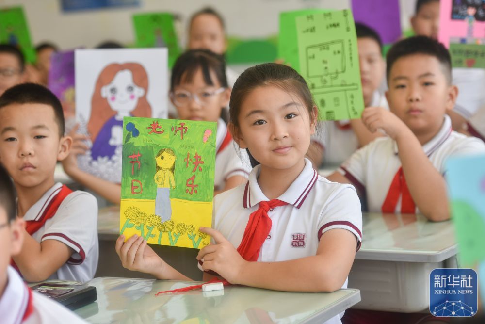 9月9日,在武漢市未來實驗小學美林校區(qū),學生為教師送上節(jié)日祝福。新華社發(fā)(趙軍攝)