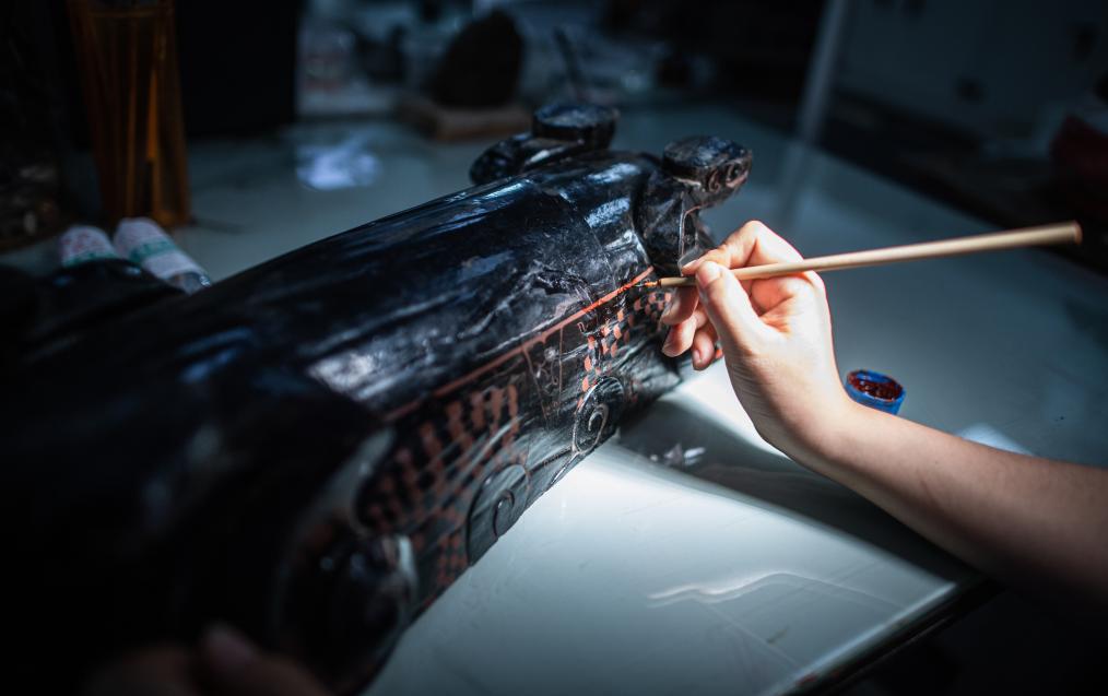 在荊州文物保護中心,文物修復人員修復一件戰國獸形酒具盒。新華社記者肖藝九 攝