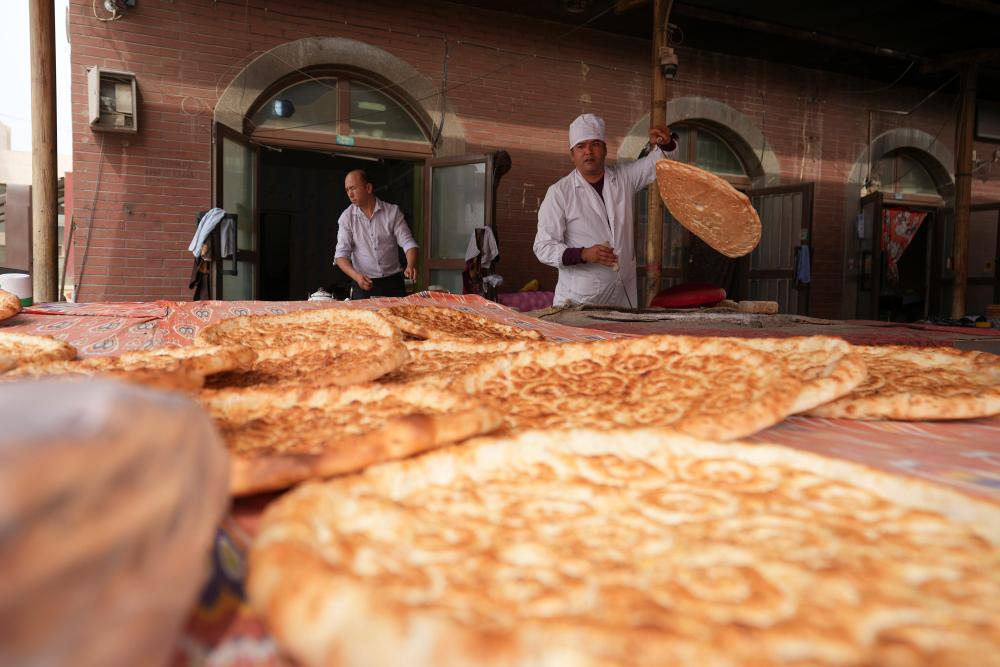 9月19日,達西村村民肉則·賽麥提(右)在文旅商業街上制作馕。近年來,達西村打造文旅商業街,吸引村民入駐,為村民增收。