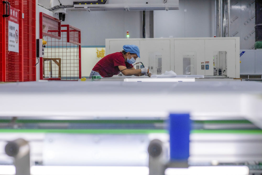 9月22日,工人在新疆巴音郭楞蒙古自治州若羌縣的國晟企誠新能源有限公司生產光伏電池片。