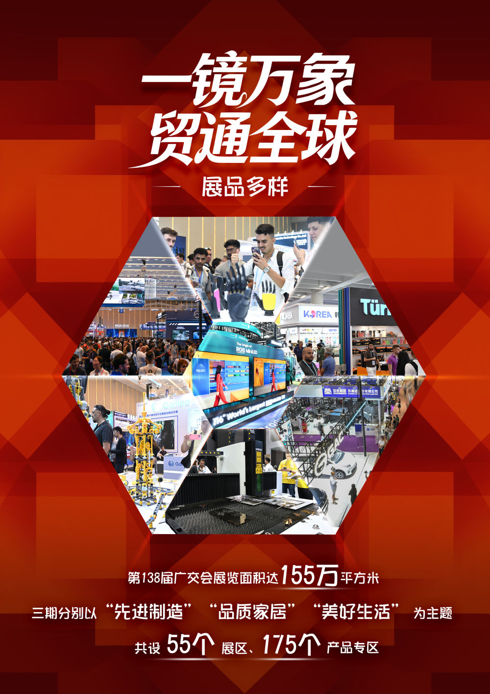 第138屆廣交會于10月15日至11月4日分三期在廣州舉辦,本屆廣交會展覽面積達155萬平方米。展位總數7.46萬個,參展企業超3.2萬家,均創歷史新高,約3600家企業首次亮相。