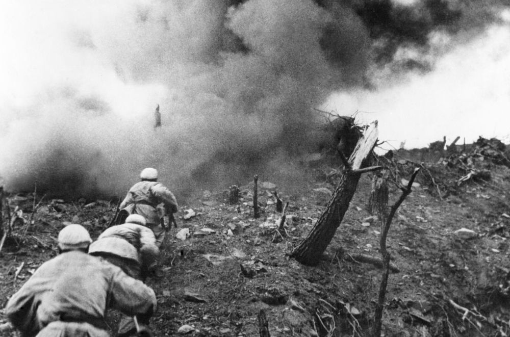 1952年,在上甘嶺戰(zhàn)役中,中國(guó)人民志愿軍指戰(zhàn)員在炮火支援下,攻上537.7高地北山。新華社發(fā)