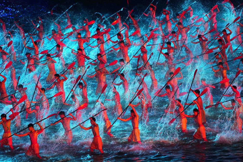 ↑11月9日,在第十五屆全國運動會開幕式上,巨型鰲魚“游入”體育場上空。新華社記者 盧漢欣 攝