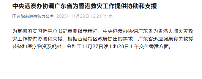 為貫徹落實習近平總書記重要指示精神,中央港澳辦協調廣東省為香港大埔火災救災工作提供協助和支援。根據香港特區政府提出的需求,廣東省迅速調集有關救援裝備和醫療物資及耗材,分別于11月27日晚上和28日上午交付香港方面。