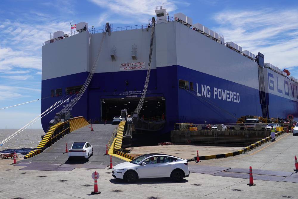 2025年7月2日,在上海自貿試驗區臨港新片區南港碼頭,一批新能源汽車駛向一艘滾裝貨輪。新華社記者 楊有宗 攝