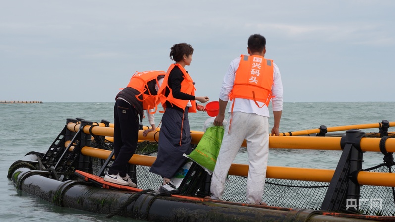 記者(中)在海洋牧場體驗飼料投喂(央廣網記者 張順鵬 攝)