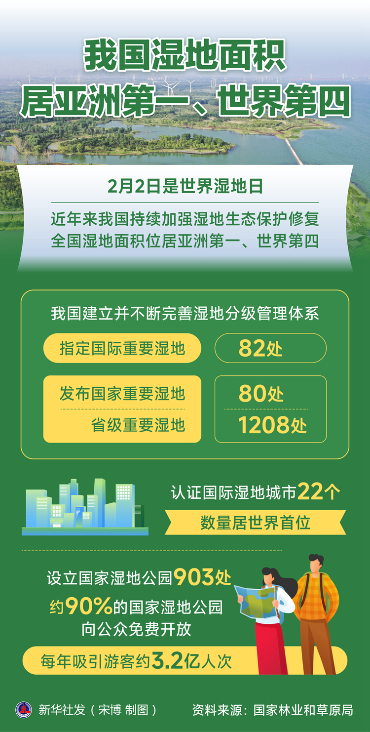 2月2日是世界濕地日。記者當天從國家林業和草原局獲悉,近年來我國持續加強濕地生態保護修復,全國濕地面積位居亞洲第一、世界第四,濕地保護形成重點治理和分類保護相結合的新格局。