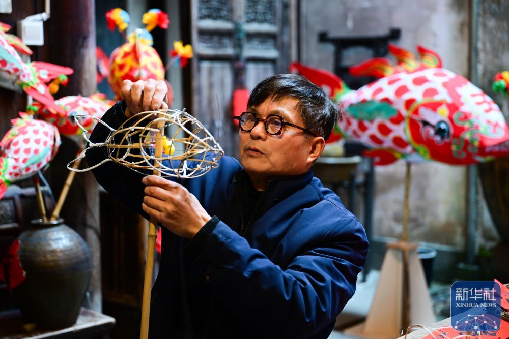 1月29日,瞻淇村的縣級非遺項目瞻淇魚燈代表性傳承人汪卓葷在制作魚燈。