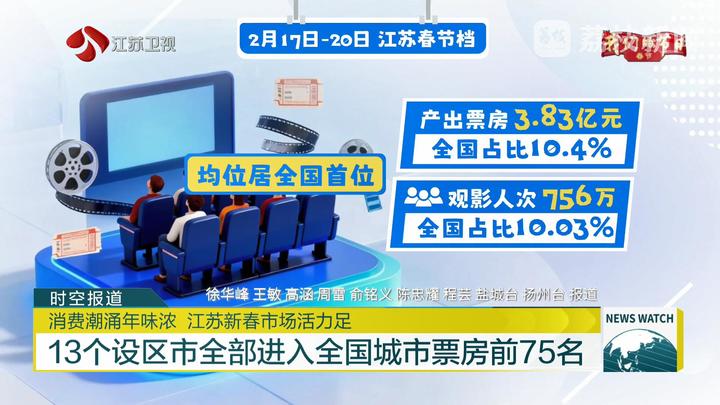 電影票房是文化消費活力的風向標。截至目前,全國春節檔電影總票房已突破40億元。作為全國票倉,江蘇電影市場持續領跑全國:2月17日至20日,江蘇產出票房超3.83億元,全國占比10.4%;觀影人次超756萬,全國占比10.03%,票房和人次均位居全國首位。放眼全國,江蘇展現出“萬馬奔騰”的票房趨勢,13個設區市全部進入全國城市票房前75名,蘇州、南京、南通、無錫、鹽城五市進入全國前20名。