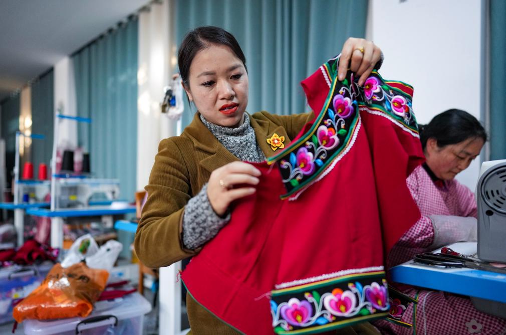 金瑞瑞在自己的工作室內查看彝繡服飾。新華社記者 陳欣波 攝
