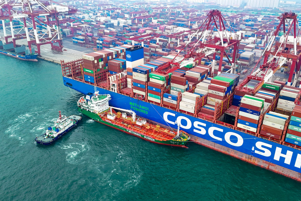 3月2日,在山東港口青島港,甲醇加注船“建航利達”輪為一艘貨輪進行綠色甲醇“船對船”加注作業(無人機照片)。新華社發(張進剛攝)
