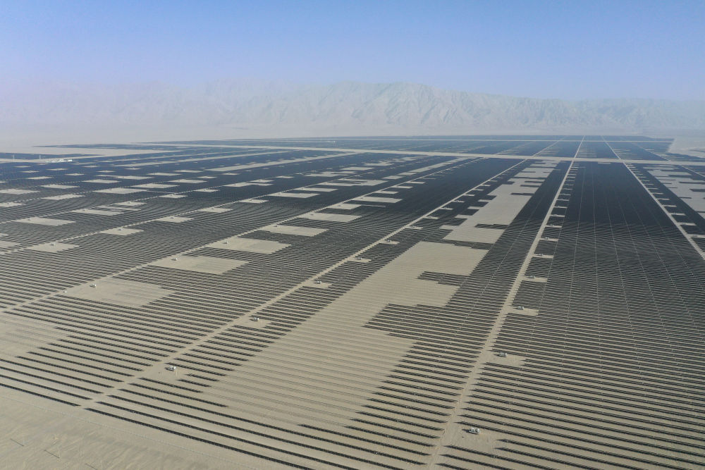 驅車行駛在巴音郭楞蒙古自治州若羌縣境內的塔克拉瑪干沙漠邊緣,浩瀚沙海中,一片片深藍色光伏板如波浪般鋪展至天際。這里是一處400萬千瓦光伏項目現場。