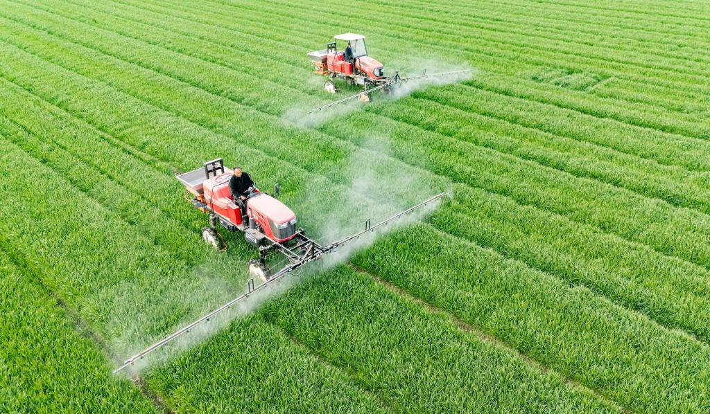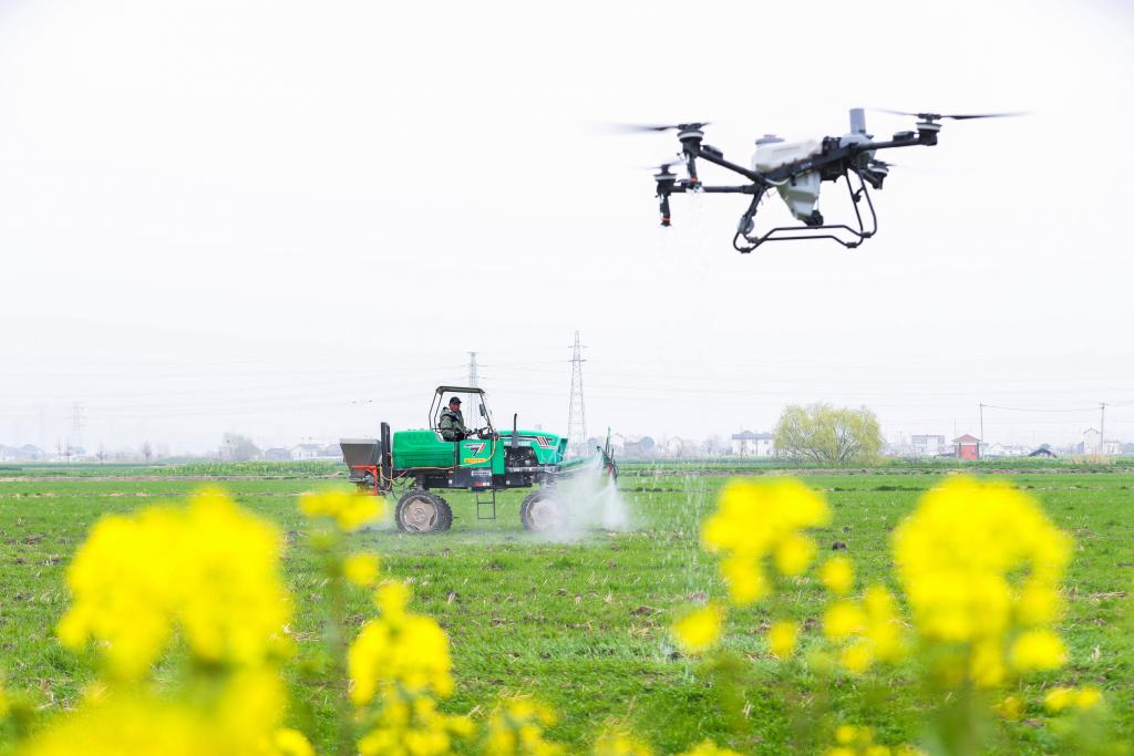 3月13日,在江蘇省興化市陳堡鎮(zhèn)蔣莊村,農(nóng)民駕駛植保無(wú)人機(jī)、自走式噴桿噴霧機(jī)實(shí)施雜草防治作業(yè)。新華社發(fā)