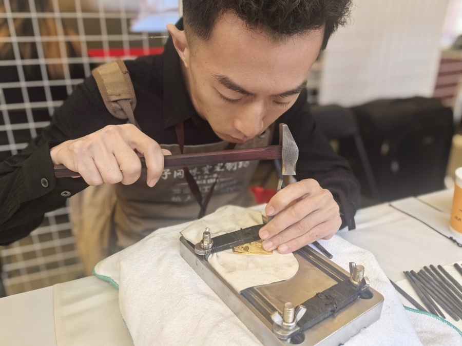 回到現(xiàn)場,95后工匠郭珺文正在演示鏨刻——這是打金中最顯手藝的環(huán)節(jié)。鏨刻臺上,金器被固定,他手持小榔頭敲擊鏨刻刀,“叮叮當當”一點一點敲出紋樣。“一般要經(jīng)過幾萬次,才能達到預期效果。”他說。攤位前,幾位上海阿姨湊近仔細圍觀,問道:“蠻靈,黃金有損耗伐?”