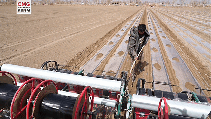 在高標準棉田里,兩臺搭載北斗導航系統的現代化棉花播種機來回穿梭,覆膜、播種、覆土等工序一氣呵成,一臺機器一天可完成上百畝地的播種任務,還能實現無人駕駛、精準直線播種、地膜覆蓋、滴灌帶鋪設等多種工作,播種效率較傳統方式大幅提升。