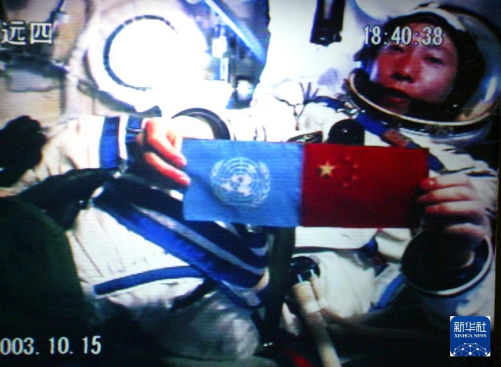 2003年10月15日18時40分,航天員楊利偉從太空向世界各國人民問好,并在艙內并列展示了五星紅旗和聯合國旗(攝于北京航天指揮控制中心大屏幕)。新華社發
