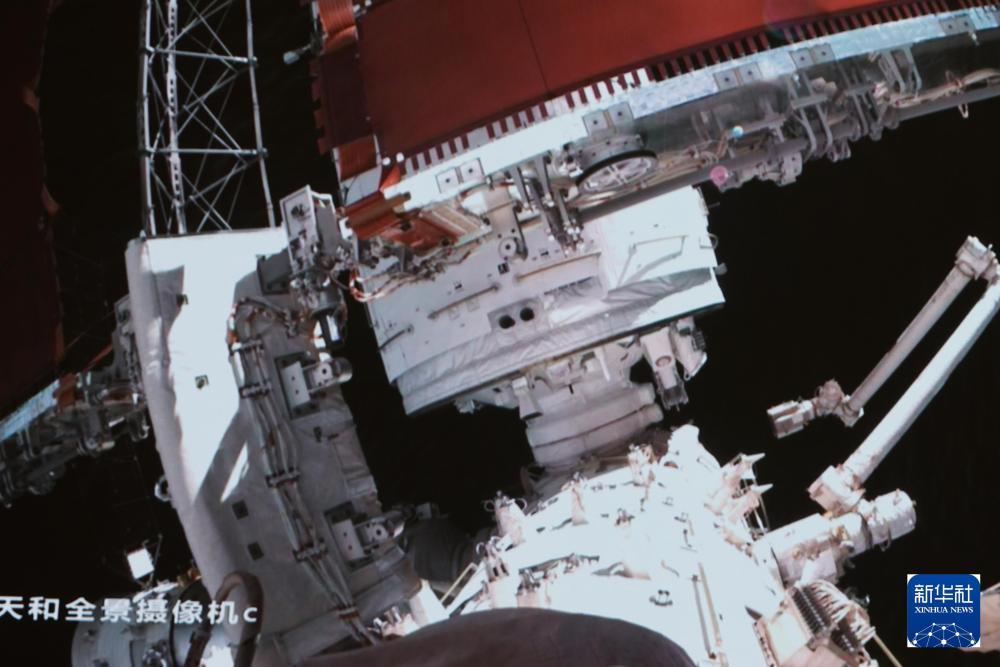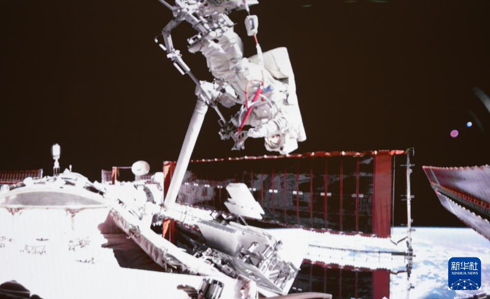 2024年5月28日在北京航天飛行控制中心拍攝的神舟十八號航天員葉光富在空間站組合體艙外作業的畫面。新華社記者 李杰 攝