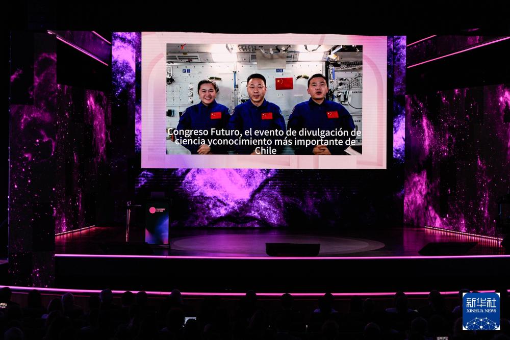 2025年1月13日,智利第十四屆“未來大會”開幕式在首都圣地亞哥舊國會大廈內舉行,神舟十九號乘組通過視頻送上祝福,預祝大會取得圓滿成功,并表達了中國和智利及拉美攜手探索宇宙奧秘的美好愿望。新華社發(豪爾赫·比列加斯 攝)