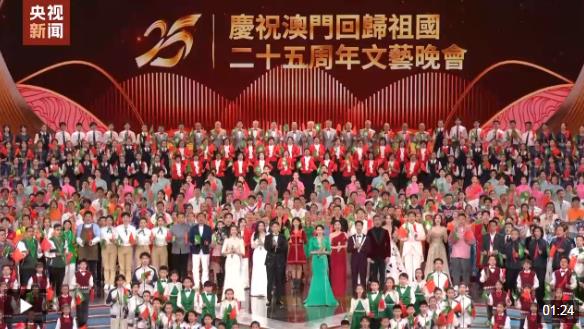 晚會(huì)最后,習(xí)近平同全場(chǎng)觀眾一起高唱《歌唱祖國(guó)》,祝愿?jìng)ゴ笞鎳?guó)繁榮富強(qiáng),祝福澳門(mén)明天更加美好。習(xí)近平向全體演員和觀眾揮手致意,晚會(huì)氣氛被推向高潮,歌聲和掌聲匯成歡樂(lè)的海洋。