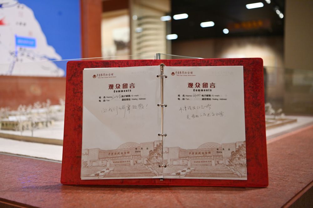 這是2025年3月27日拍攝的平津戰役紀念館觀眾留言簿。一名觀眾寫下“向我們的前輩致敬!”