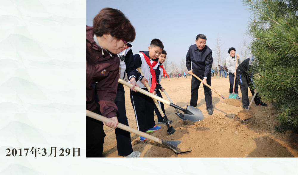 率先垂范、身體力行。此后13個春天,習近平總書記堅持同干部群眾一起參加義務植樹活動。永定河畔的濱水綠廊,城市副中心的綠心公園,產業疏解后改造的開放綠地,環境整治后打造的生態空間,都曾見證總書記躬身植綠的身影。
