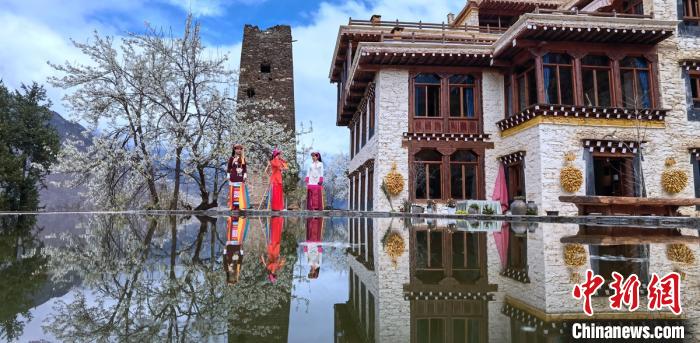 藏寨、碉樓下盛開的梨花,丹巴女孩穿梭鄉(xiāng)間小路。劉忠俊 攝