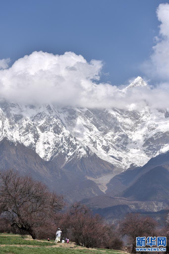 3月28日,游客在西藏自治區林芝市索松村欣賞與雪山相映的桃花。新華社記者 孫瑞博 攝