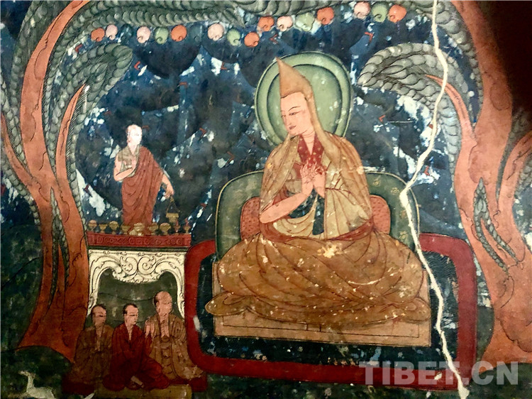 自從朗達瑪滅佛以來,佛教在吐蕃遭到了致命的打擊,一些僧人避難至遙遠的阿里,保存了佛教的火種,并且開啟了藏傳佛教的后弘期。托林寺雖遠在西藏邊緣一隅,卻在藏傳佛教后弘期扮演了重要的角色。11世紀,受阿里地區的統治者絳曲沃和大譯師仁欽桑布之請,阿底峽由納措催成杰瓦、俄列貝希繞、甲尊僧格等五人到印度迎請來到托林寺,駐寺三年,幫助校譯佛經。后又至衛藏、拉薩等地譯經,成為西藏復興佛教的一位重要人物。關于這一段歷史的表述,托林寺壁畫中有這樣一幅小圖。圖右邊戴帽者為主佛阿底峽尊者,阿底峽為古印度僧人、佛學家,聲名極盛。左上角站立者是拉喇嘛絳曲沃,左下三人分別為:譯師納措催成杰瓦、俄列貝希繞、甲尊僧格。