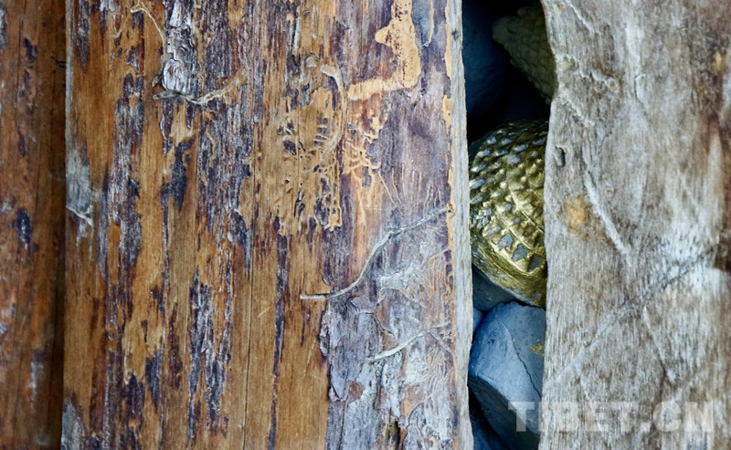 上百年的羊皮經筒,里面裝著厚厚的一匝匝經卷,被若干次轉動后,羊皮裂開了口子,巧手的藏族群眾用皮繩將歲月的裂口密密縫住,經筒又可以轉繞好多年。擦康被木板封住了,小蟲在木板上啃蝕出畫作一樣的痕跡,木板縫隙中,閃耀著金色的光芒,光芒來自擦康里放置的擦塔——一個上面有著108座小塔的擦塔。