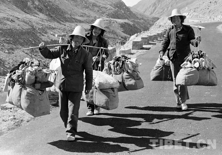 這是三位肩挑商品,走進(jìn)藏北高原的內(nèi)地“候鳥”型貨郎(唐召明1989年攝)