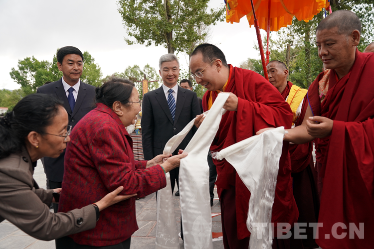 圖為西藏自治區(qū)黨委常委、統(tǒng)戰(zhàn)部部長(zhǎng),區(qū)政協(xié)黨組副書(shū)記、副主席旦科與班禪互敬哈達(dá)、互致問(wèn)候 攝影:王淑