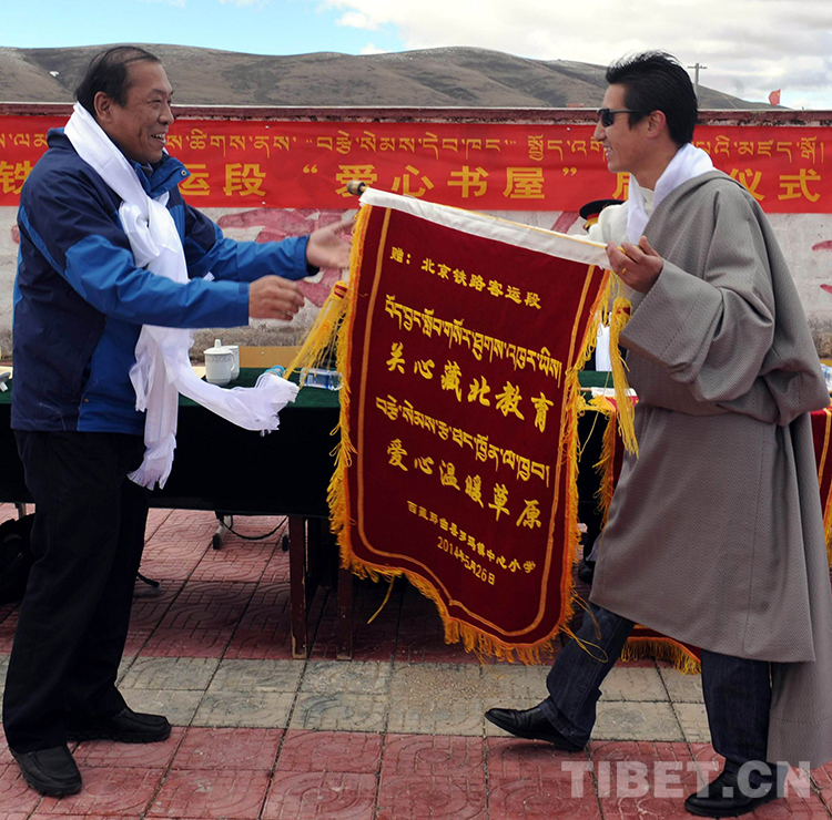 這是西藏那曲地區(qū)那曲縣(現(xiàn)那曲市色尼區(qū))羅瑪鎮(zhèn)中心小學(xué)校長(zhǎng)拉巴格桑(右)代表學(xué)校向北京鐵路客運(yùn)段代表王博軒(左)贈(zèng)送錦旗(唐召明2014年5月29日攝)