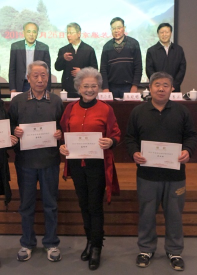 這是霍鐘權、盛瑞玲、李業壯(前排從左至右)在北京建藏援藏工作者協會代表大會上受到表彰(唐召明2019年1月26日攝)