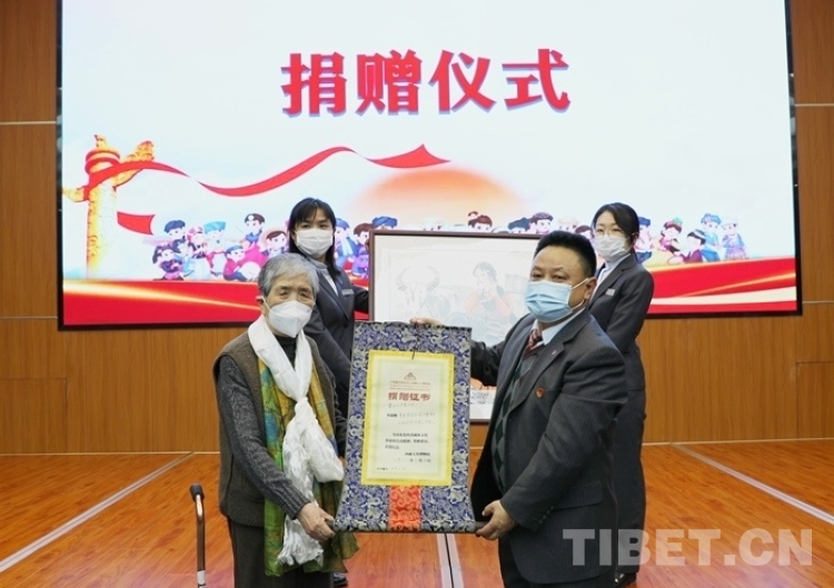 圖為中國藏學研究中心西藏文化博物館向畫家吳茜女士(左)頒發捐贈證書