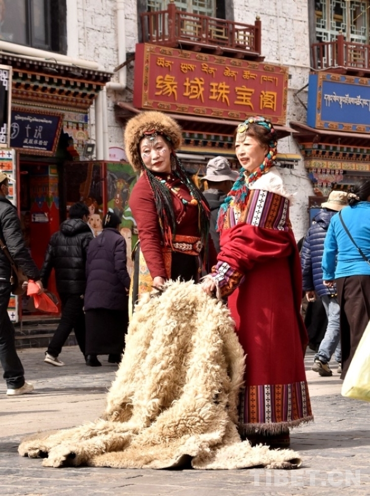圖為3月15日,游客身著藏族傳統服飾在拉薩八廓街拍照留念 攝影:次旦拉姆
