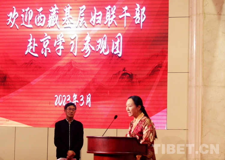圖為西藏自治區(qū)婦聯(lián)黨組成員、副主席澤仁卓嘎(右一)在北京建藏援藏工作者協(xié)會在北京西藏大廈為“2023年西藏基層婦聯(lián)干部赴京學習參觀團”成員們舉行的歡迎會上發(fā)言 攝影:劉莉