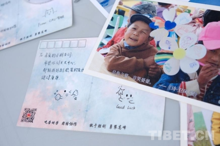 參與活動的同學們在峰云社人文科考隊準備的明信片上寫下對當地小朋友美好的祝福。一張張寫著滿滿關切話語、畫著生動可愛圖案的明信片上,飽含著中國農業大學師生對雪域高原孩子們滿滿的愛意。