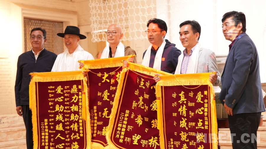 活動最后,中國藏學出版社向拉薩市特殊教育學校學生贈送繪畫用品,拉薩市特殊教育學校云旦平措校長、尼瑪書記向現場來賓贈送新書。