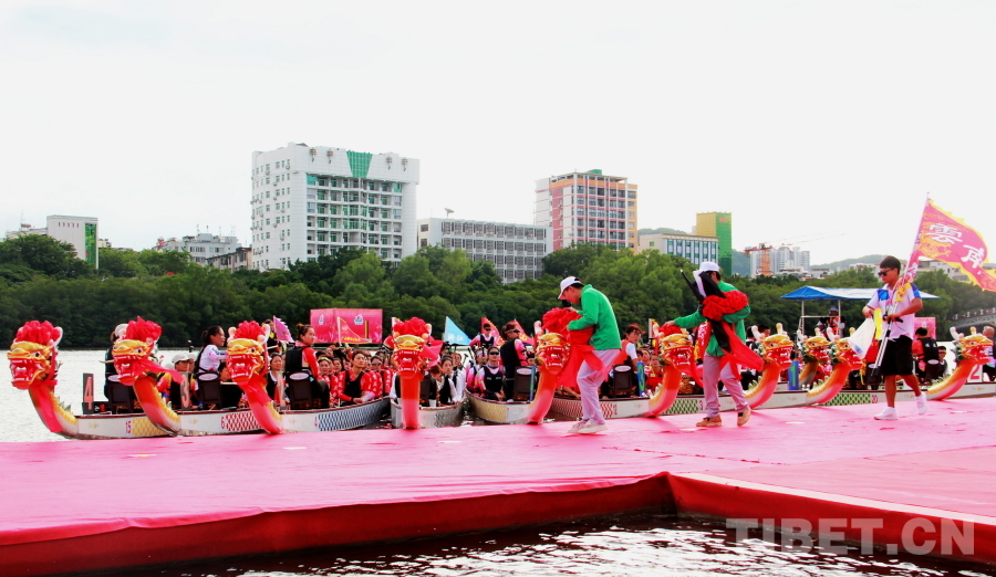 賽前,在龍舟巡游活動后,國家民委副主任郭衛平,海南省委常委、宣傳部部長王斌,香港代表團顧問、中國香港體育協會暨奧林匹克委員會會長霍震霆,香港代表團團長,香港文化體育及旅游局體育專員蔡健斌,國家民委文化宣傳司司長張謀,國家民委港澳臺辦公室主任魏國雄,海南省政府副秘書長國章成,國家民委文化宣傳司副司長張劍輝,國家民委港澳臺辦公室副主任趙靜,海南省民委副主任黎梁東,海南省旅文廳副廳長王忠云,海南省三亞市政府副市長張長豐為龍舟點睛、披紅,將比賽氛圍烘托得格外喜慶熱烈。