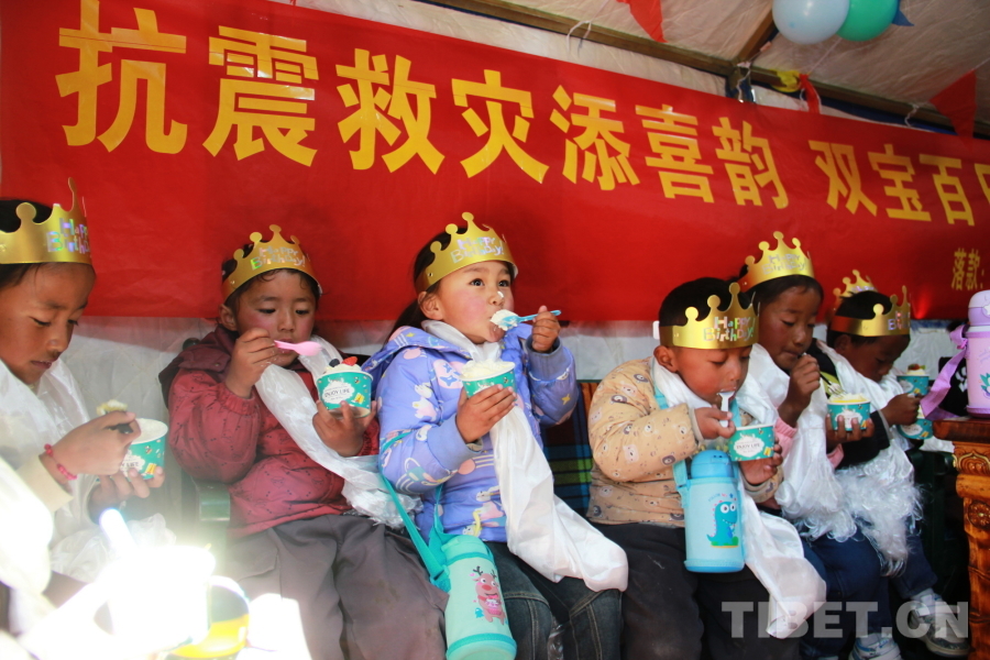圖為西藏自治區日喀則市定結縣江嘎鎮榮貢村的小朋友們參加“情暖震后帳篷,共賀雙寶百日”活動 攝影:劉莉