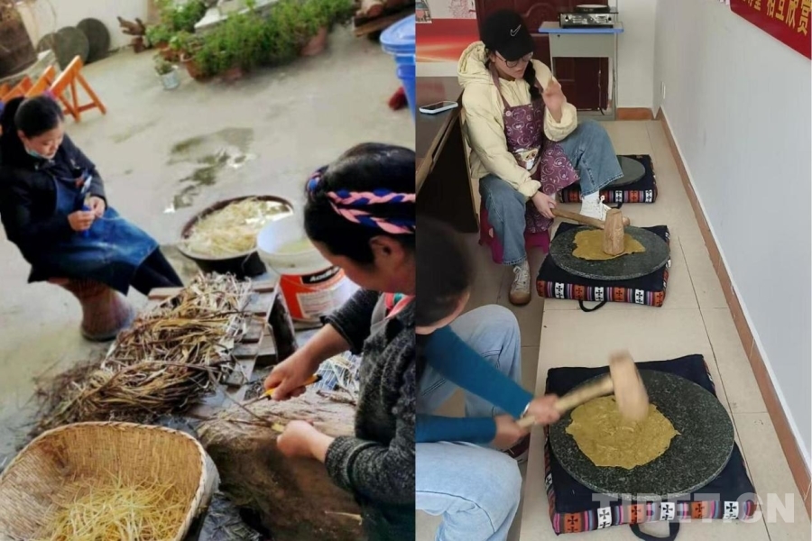 關(guān)于藏紙的起源,學(xué)術(shù)界更偏向《舊唐書·吐蕃》中的記載:唐高宗時期,吐蕃贊普葉宗弄贊(注:松贊干布)“因請蠶種及造酒、碾、磑、紙、墨之匠”,隨文成公主入藏。自此,西藏關(guān)于紙的技藝因地而成,代代相傳。1300多年后的一個清晨,在金東鄉(xiāng)的工坊內(nèi),記者見到了金東藏紙制造技藝非遺傳承人加里,也看到了藏紙一大分支——金東藏紙中的古法脈搏。