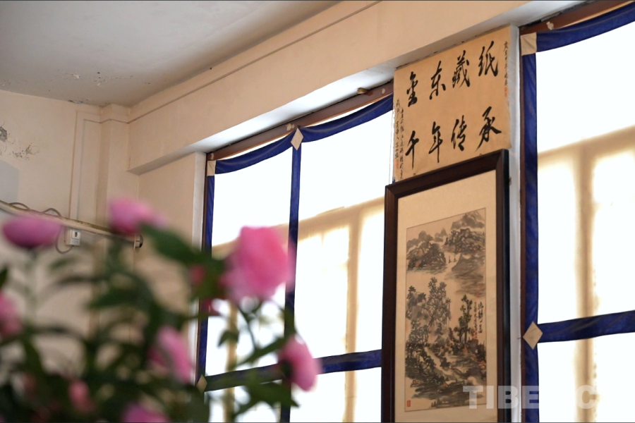 圖為工坊內(nèi),掛著寫有“金東藏紙 千年傳承”的金東藏紙裝飾書法 攝影:邊子捷